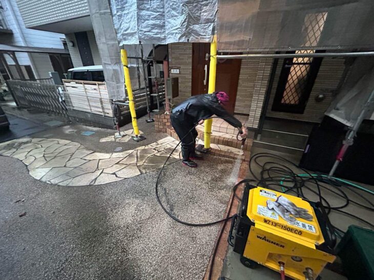 こんにちは!今日は、外壁塗装工事の中でも重要な工程である「高圧洗浄作業」についてご紹介します。