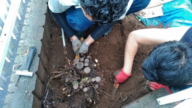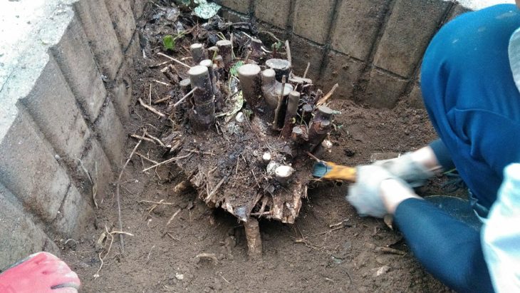 予想通り根っこが地中まで伸びていました。手で抜くのは難しいので、のこぎりで太い根から一本、一本コツコツと切っていきます。