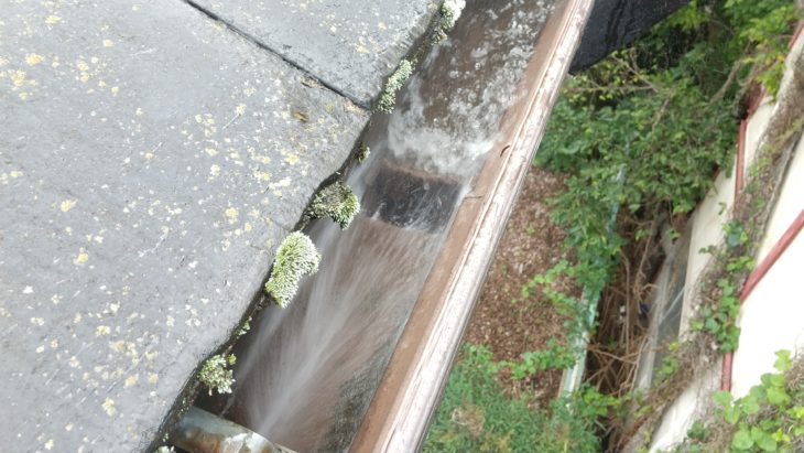 ホースで雨樋に詰まっていた泥や苔を流し落としていきます。