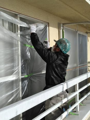 養生シートを貼っている様子です。