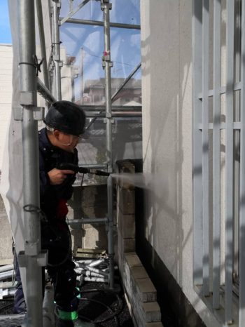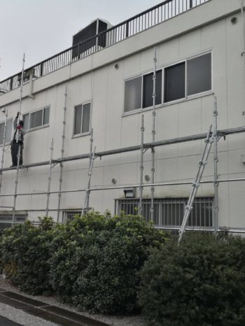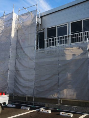 足場作業が終わり、メッシュシートが貼り終わりました。