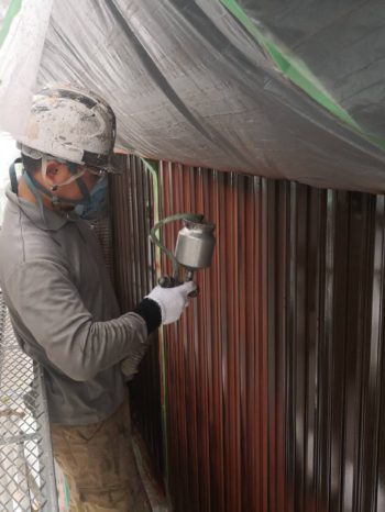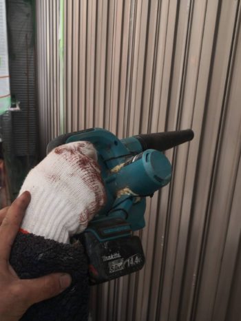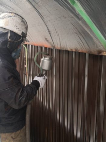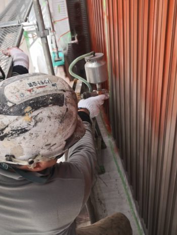 錆止めを吹き付けている様子です。雨戸は専用の機械で吹き付けていきます。
