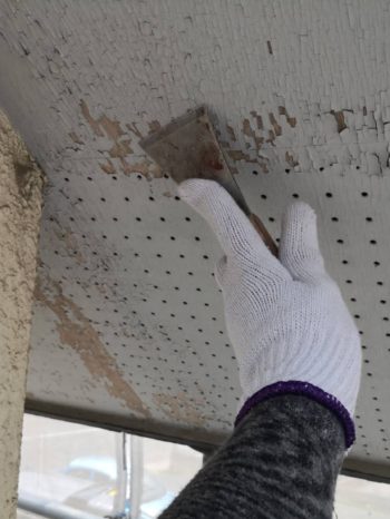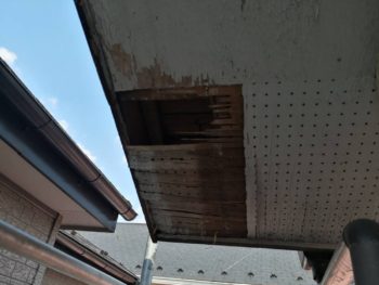 施工前、軒天の様子です。劣化により、大きな穴が開いてしまっています。
