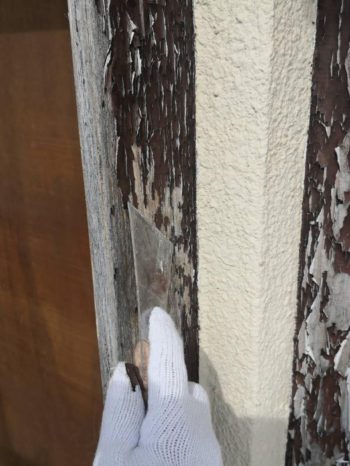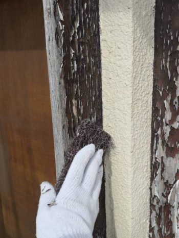 戸袋のケレン作業の様子です。皮すきという専用の道具で古い塗料などを削っていきます。