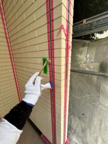 剥がした箇所にプライマー(コーキング剤と下地との接着強化をする)を塗っていきます。この一手間が綺麗な仕上がりに繋がります。