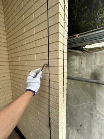 既存のコーキングを剥がす作業の様子です。