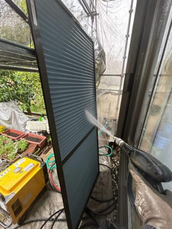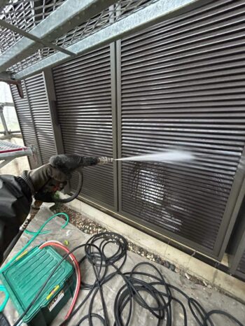雨戸の高圧洗浄作業の様子です。