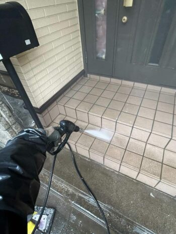 玄関タイルの洗浄の様子です。