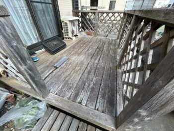 ウッドデッキの様子です。全体的に傷んでしまっていました。割れている箇所もありました。