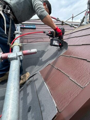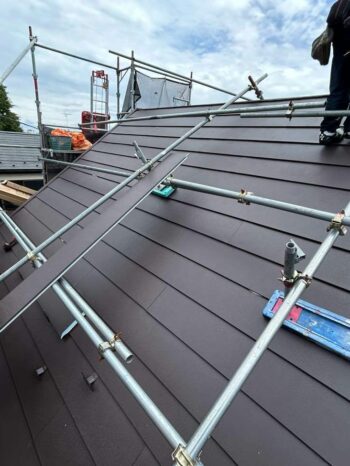 屋根材を取り付けている様子です。今回、「スーパーガルテクト」という屋根材を使用しました。スーパーガルテクトは瓦屋根に比べ軽量で、金属製の為、地震時の「割れ」の心配がありません。