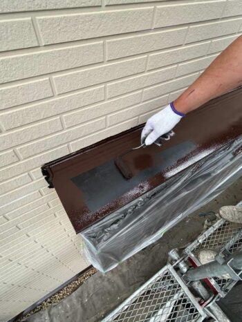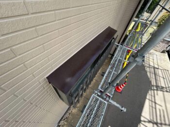 霧除けの中塗り作業の様子です。この後上塗りをして霧除けの塗装は完了です。