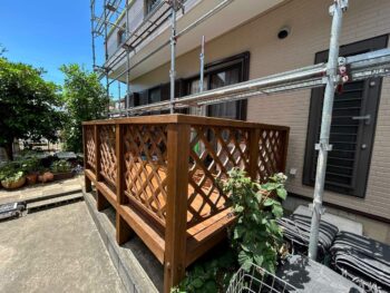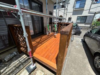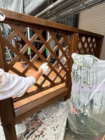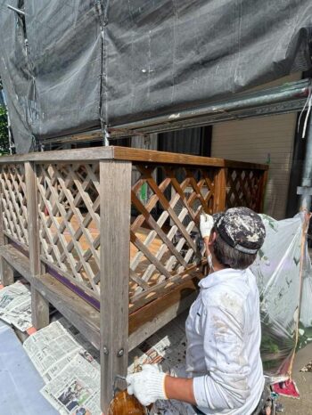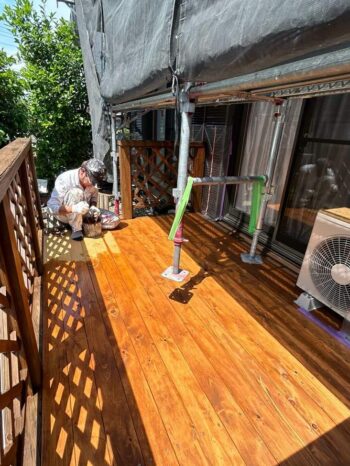 取り付けたウッドデッキに塗装している様子です。木部塗装の為、腐食に強い特殊な塗料を使用しています。
