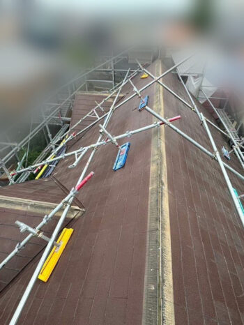 足場作業の様子です。あいにくの雨でしたが細心の注意を払って作業しました。