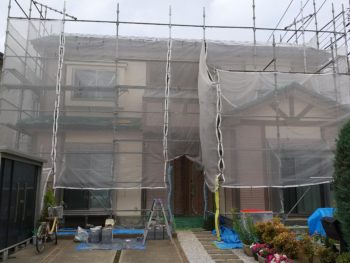 メッシュシートが家全体に貼られた様子です。