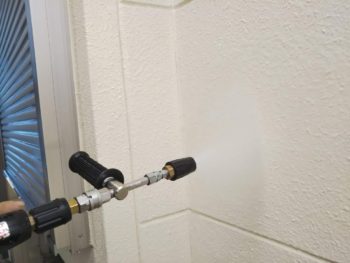 高圧洗浄機で外壁の汚れを落としている様子です。